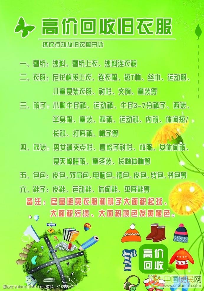 衣物回收:旧衣服 鞋子 箱包 背包 毛衣 夹克 床单 被罩 窗帘等。